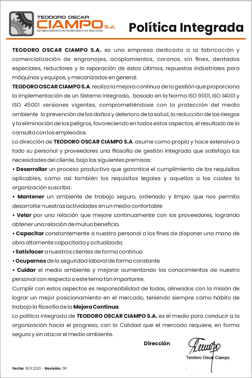 Teodoro Oscar Ciampo SA, fundada en 1968, es una industria metalmecánica de precisión. Brindamos servicio de mantenimiento industrial consistente en la fabricación de engranajes, sinfines y coronas, reductores especiales, gatos a tornillo, acoplamientos navecilla, repuestos industriales para máquinas y equipos, en general y dentados en particular.